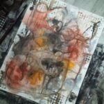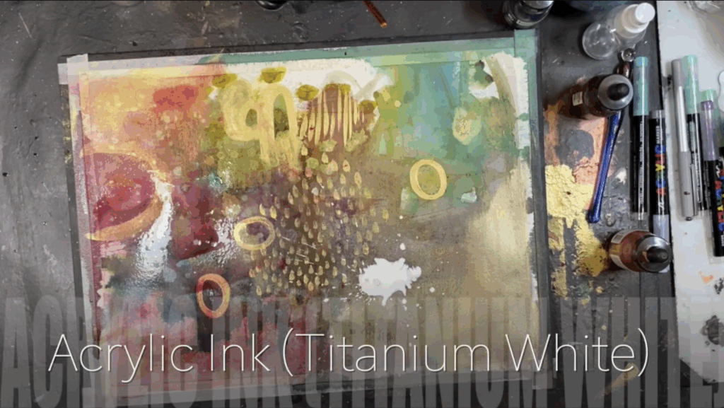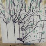 Marks made in shimmering gold, I moved on to splish splashing on some acrylic ink in a muted grey that looks like aubergine to me, and muted violet that looks like pomegranate juice. A little white ink finished us off.