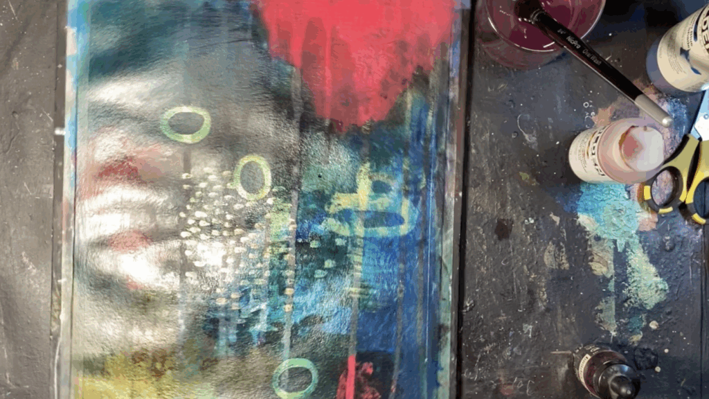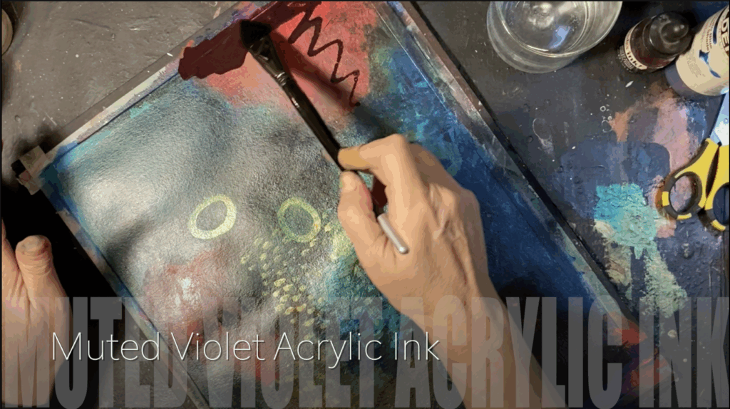 The violet acrylic ink and DRIPPAGE which I added later on in the process looked like it might be trying to tell me something, but I wasn’t into it. There’s enough going on, thank you so much, violet drips. Let’s push you all the way back. Wiping it back gave me the cool rain on the window effect I ended up with!