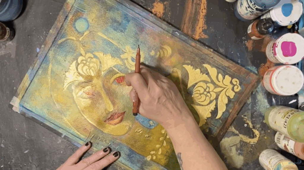 I added pupils with the black brush tip pen and then lightened up the area around her iris with gold paint.