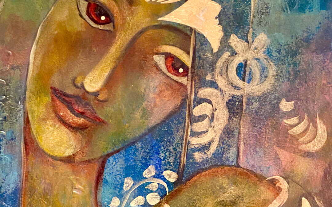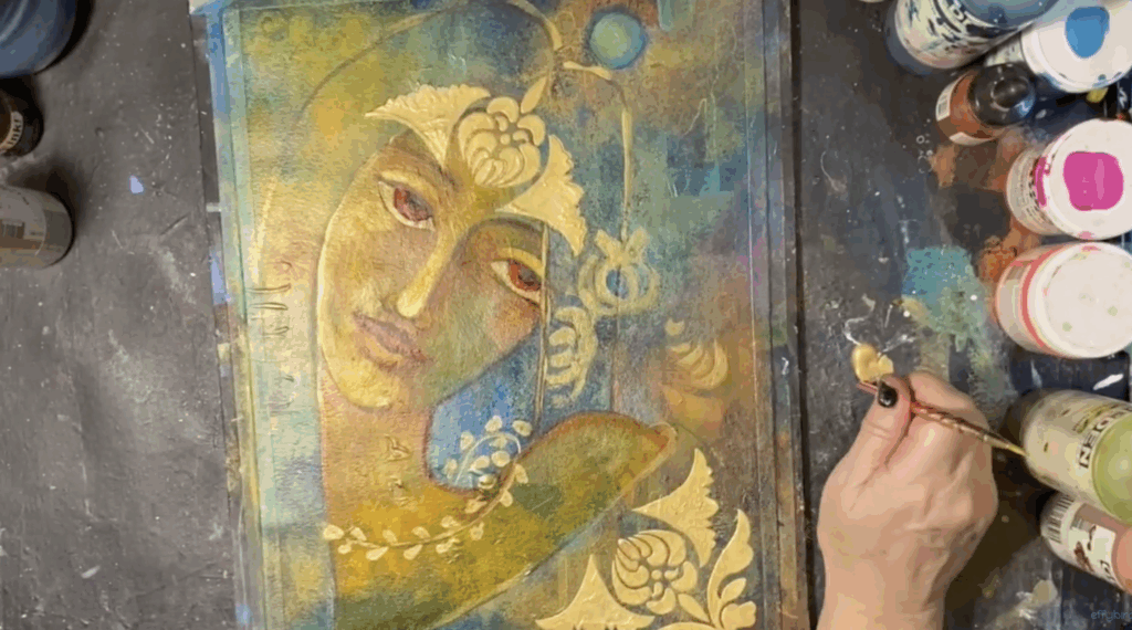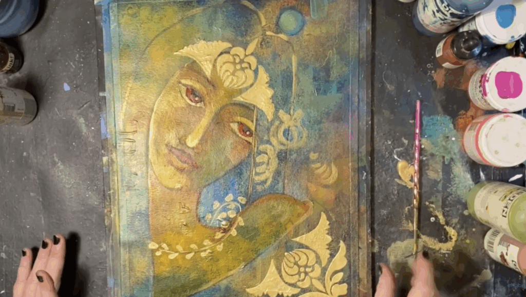 She’s starting to look like an iconic portrait now, and while that wasn’t my intention going in (I had no intention going in!) that makes me happy. I haven’t done an iconic portrait in a very long time. My taste for those waned with my vision through the ever worsening cataract saga, and I wasn’t sure I’d ever paint one again, but here she is. An icon.