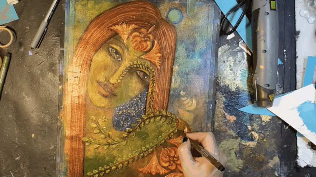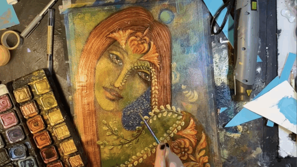 Today I had a burning idea to create that little galaxy in the area between her face and hair. I used my old faithful technique of layering metallic watercolour paint (Fine Tec) over black gesso, and because I knew YESTERDAY that this was what I wanted to do TODAY, I was able to get into a flow state with things really easily.