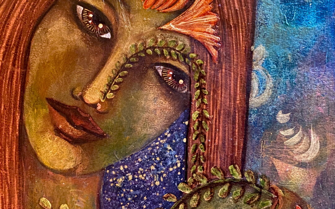 I finished the day by grounding the work, glazing over the gold leaves with Pitt Pens (Permanent Olive/Dark Sepia). But the real work was mental: setting the hook for my future self. That line of leaves along her garment is reminding me of a spinal column, but the question is whose spinal column might it be?