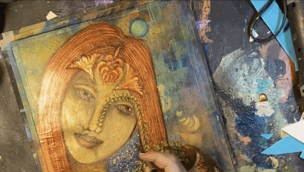 I dove in, using the iridescent light copper to redefine the shape, and yes, I know I’ve created a bit of a bobble head effect as a result, but I can fix that at some future point when I’m ready to work on the neck.