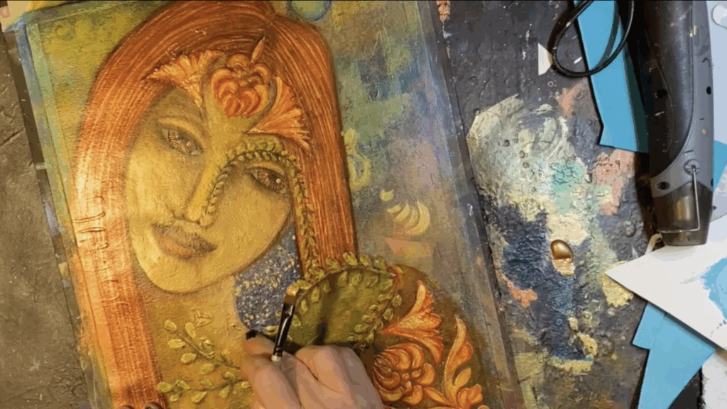 The boldest move of the day, though, was to create a new ground where I could give her a sparkly aura —one that connects to the little universe by her face. I took the most assertive, opaque medium I’ve got in my toolbox—black gesso, my magic potion, my mixed media bestie—and created a new ground around her head. EEP!
