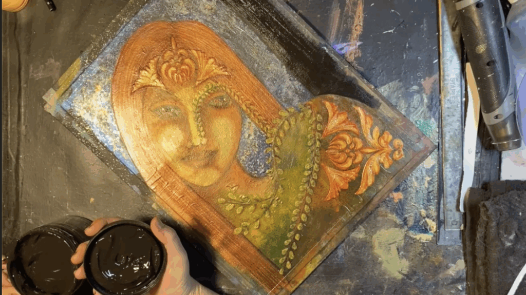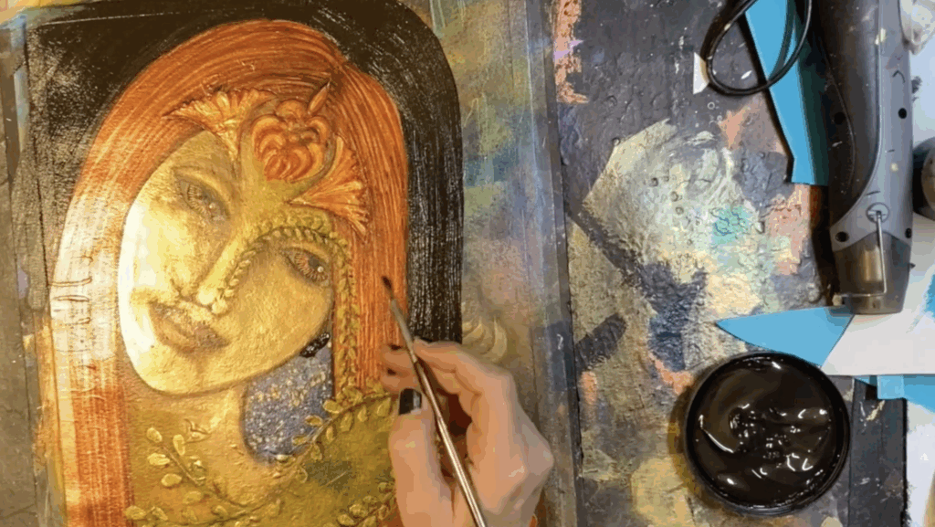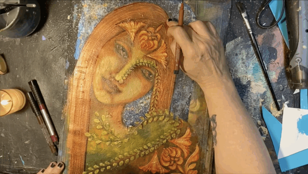 Yesterday’s move to black out some of the background gave me this big, matte, velvety field of possibility around her head. (Bless black gesso forever and ever, so say we all.) I left the table with a clear idea. Tomorrow, I’m going to give her the cosmos. So when I lit my candle today, I wasn’t flailing. I wasn’t staring at her wondering where to even start. I already had my first move.
