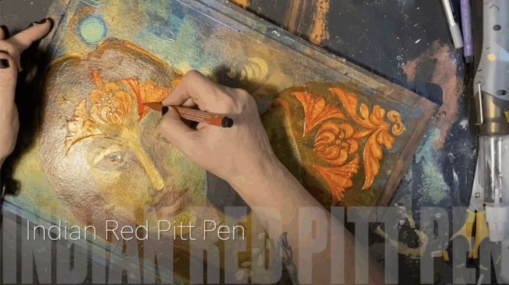 I decided that the anatomical issue with her eye drifting too far from the bridge of her nose is not a RIGHT NOW problem. I opted to leave that for NEXT WEEK ME, or maybe even NEVER ME. I turned my attention to what’s RIGHT instead and focused on deepening the embellishments with some Pitt Pen instead of trying to “fix the eye”.