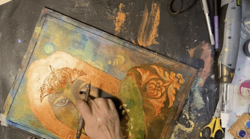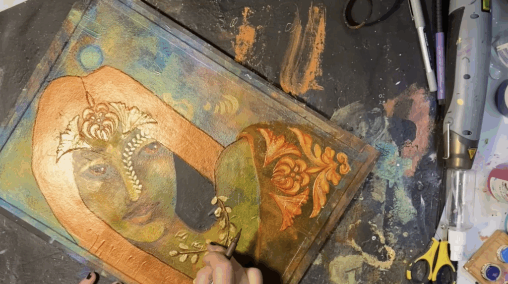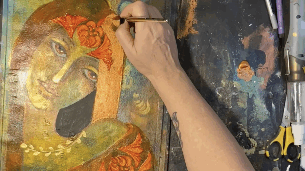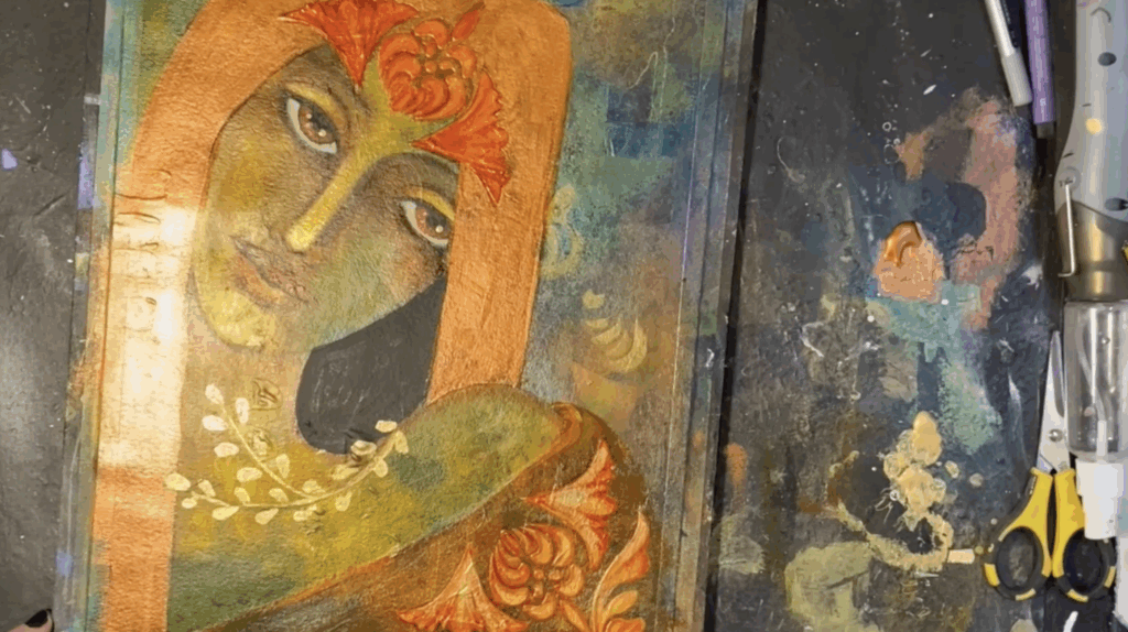 I came to the page with the intention of honoring all I’ve learned so far. This meant focusing on the area around the “adorn the flaw” leaves we worked on yesterday. I used the iridescent fine gold, not just to highlight, but to push back the old line of her eyebrow, allowing the leaves to replace it. This is a powerful act: letting a new, organic form replace an old, rigid boundary. Who knew our paintings could become our life coaches, eh? WELL NOW WE KNOW.