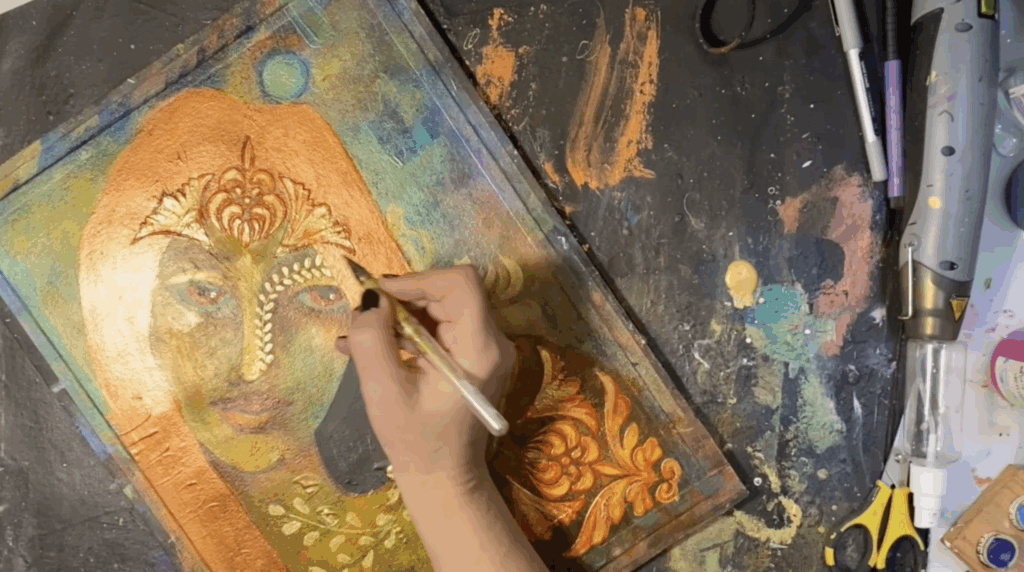 I pulled out the gold paint (my cue to the universe that I need a little divine intervention) and went to work. I focused on the figure, adding gold to her crown and dark sepia shading around her features and leaves.